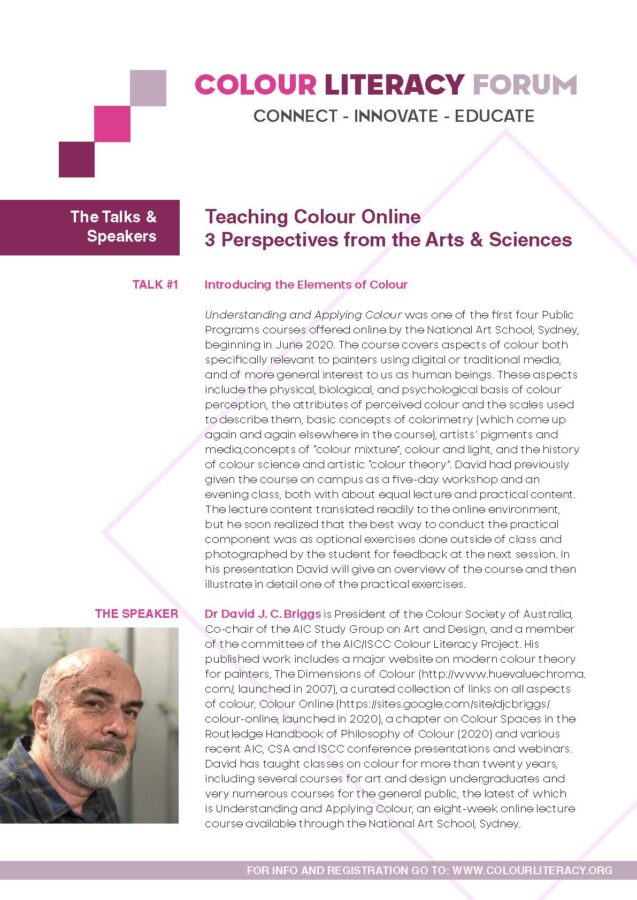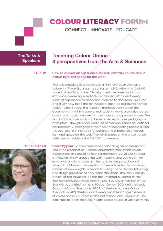 Värit ovat osa sekä jokaisen ihmisen arkikokemuksia että syvimpiä esteettisiä elämyksiä. Havaitsemme värejä ja nautimme niistä luonnossa, rakennetussa ympäristössä, taiteessa ja viihteessä. Mutta mikä on värien ja sanojen, värikokemusten ja kielen suhde? Voiko värikokemuksia ylipäätään jakaa tai kuvailla, ja miten nimeämme värejä? Mistä värinimet tulevat ja mitä niillä voidaan kommunikoida? Kolme asiantuntijaa pohtii näitä kysymyksiä yhdessä yleisön kanssa tunnin mittaisessa keskustelutilaisuudessa. 21.15–21.45 Kuulemme ensin kolmen asiantuntijan johdannot, jonka jälkeen noin klo 21.45 alkaen asiantuntijat keskustelevat aiheesta toistensa ja yleisön kanssa. Asiantuntijoina kielentutkija, väitöskirjatutkija Veera Hatakka (Helsingin yliopisto), yliopettaja, taiteen tohtori Pirjo Seddiki (Hämeen ammattikorkeakoulu) ja kuvataiteilija, väritutkija Harald Arnkil.