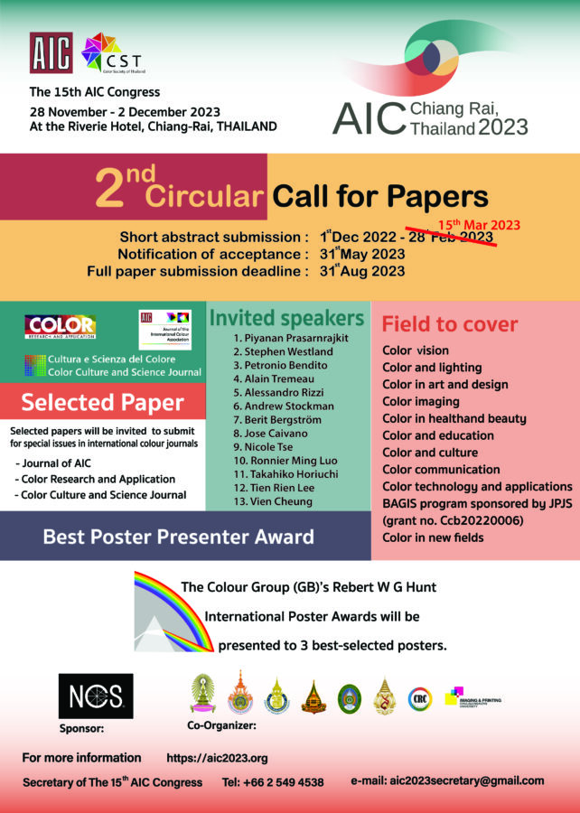 The short abstract submission of AIC2023 the 15th Congress of the International Colour Association is extended the deadline from February 28th to March 15th, 2023.